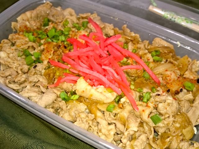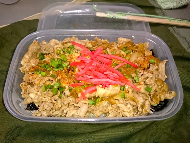 ご飯に海苔をしき、キャベツをしいてその上に肉を乗せる。