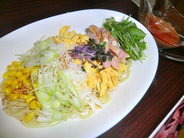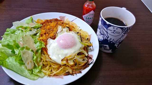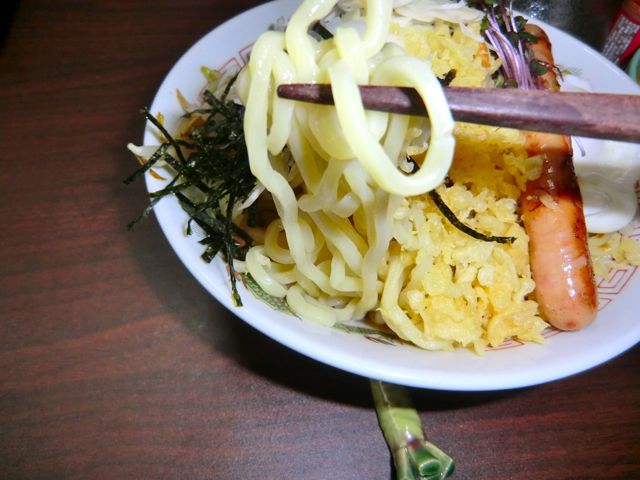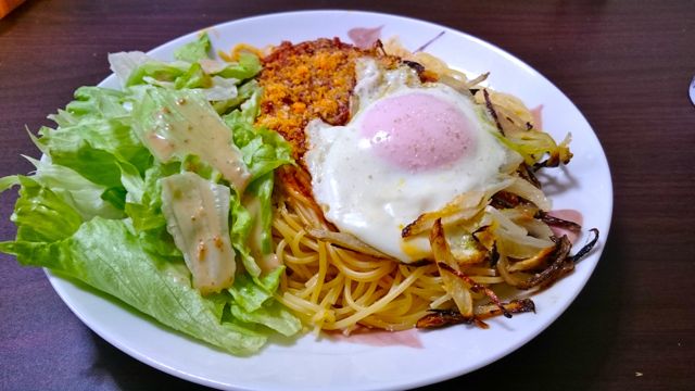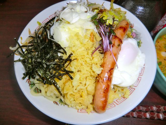 冷蔵庫の有り合わせものを乗せて、よく混ぜて食べる。