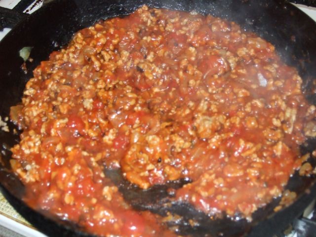 ニンニクのみじん切りをオリーブオイルで炒めたら、タマネギのみじん切りをひき肉を炒め、トマトソース(あらかじめ香辛料や具材が入ってて、味付けされてるやつ)を入れて、少し煮るような感じで火を通す。