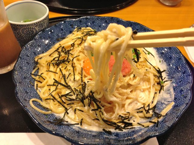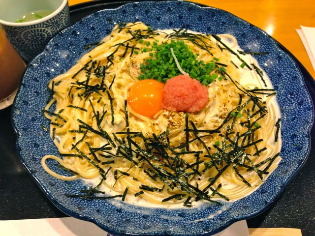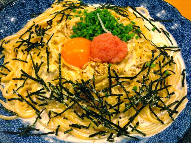 たらこと湯葉とモッツァレラチーズのカルボナーラ。