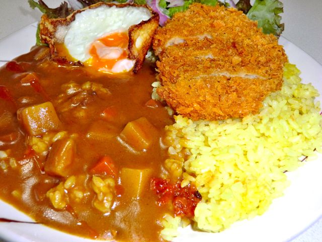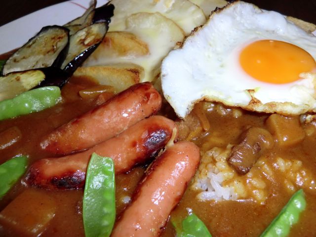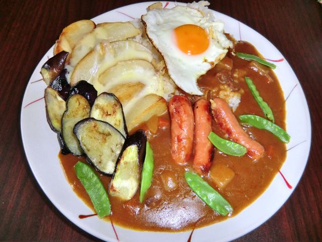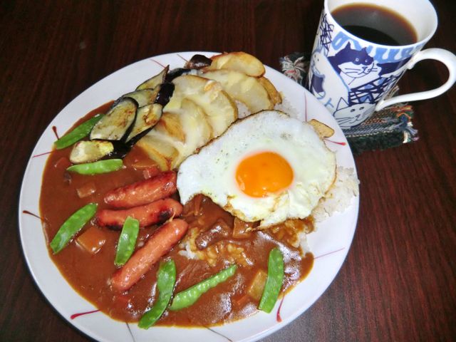チーズポテトと焼き茄子と目玉焼きとウインナーのカレー。