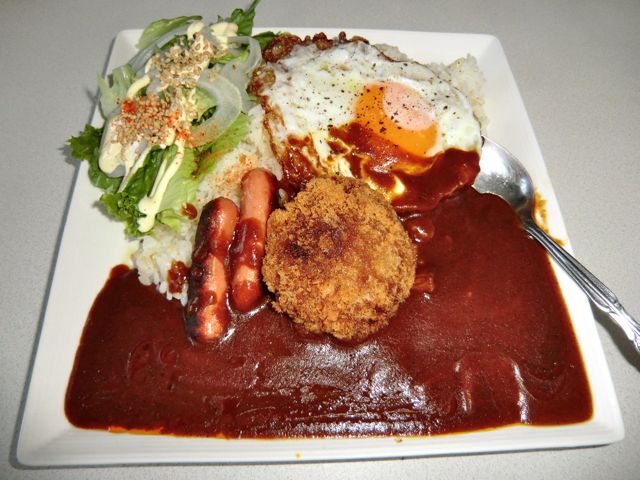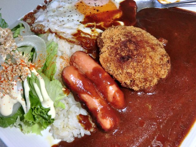 げんこつメンチにソーセージ、目玉焼き、野菜サラダを乗せて。