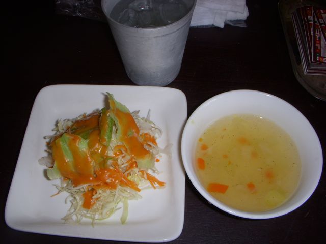 サラダとスープだが、サラドレッシングはサウザンなのだが、これにスパイスが入ったドレッシングもあるようだ。