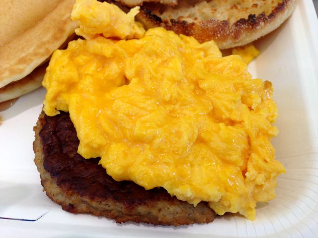内容としては、分解されたソーセージマフィンに、スクランブルエッグとホットケーキがついてる。