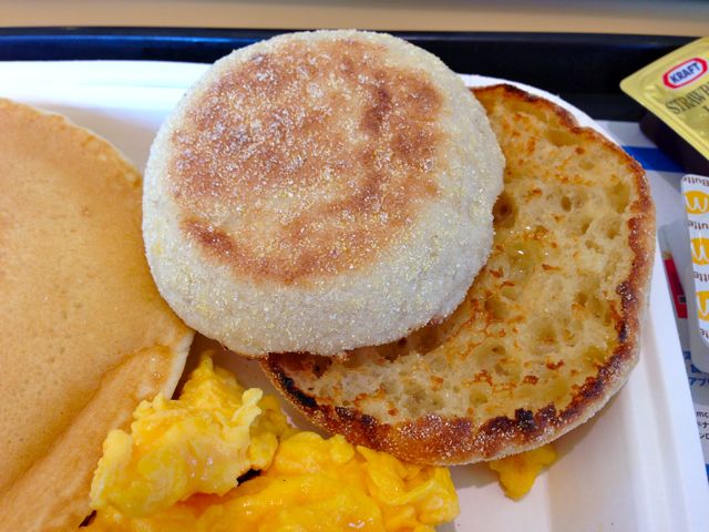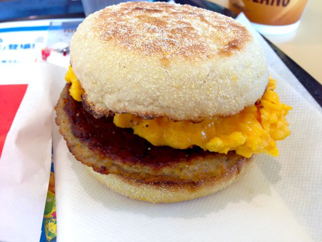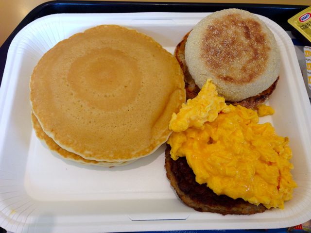 内容としては、分解されたソーセージマフィンに、スクランブルエッグとホットケーキがついてる。