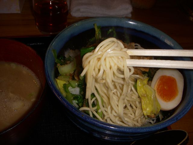 このラーメンは、汁無しそばとつけ麺を合体させたおもしろいもので、味噌で味付けされた豚バラが、量も多くのっていて、これはかなりいける感じだった。