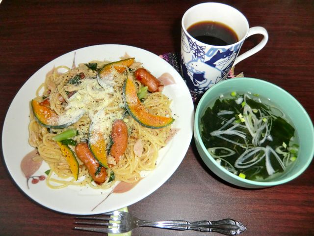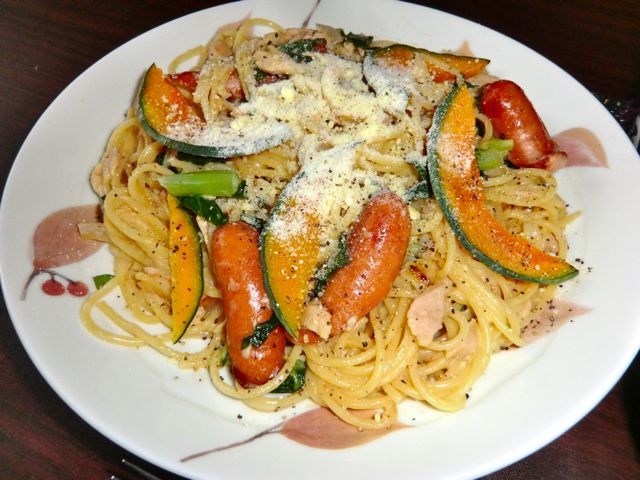 ソーセージとカボチャと大根の葉のツナクリームスパゲティー。