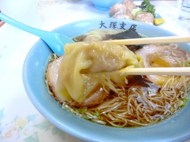 ここ大塚支店のワンタンは、きわめて具が大きく、肉のかたまりがワンタンの皮で包まれているスタイル。