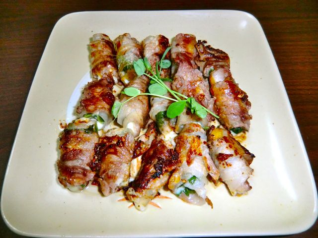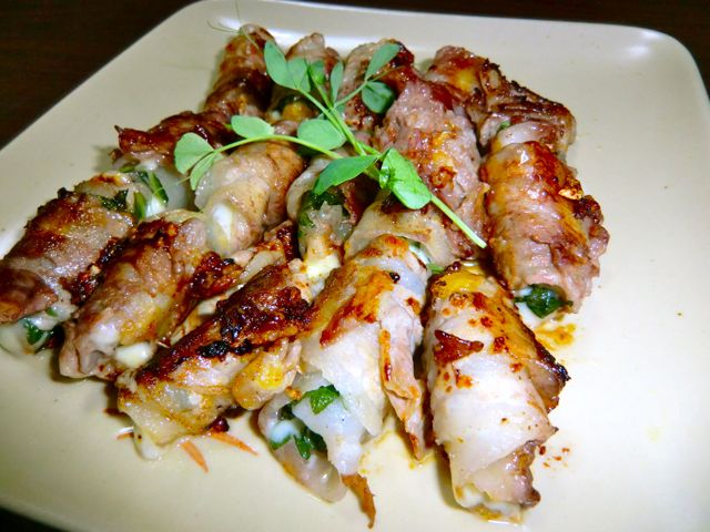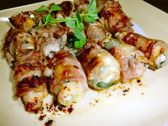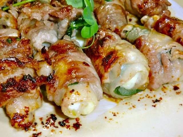 青じそとチーズを豚バラで巻いたもの。