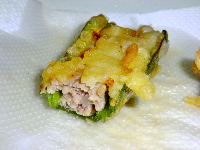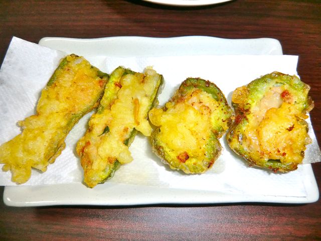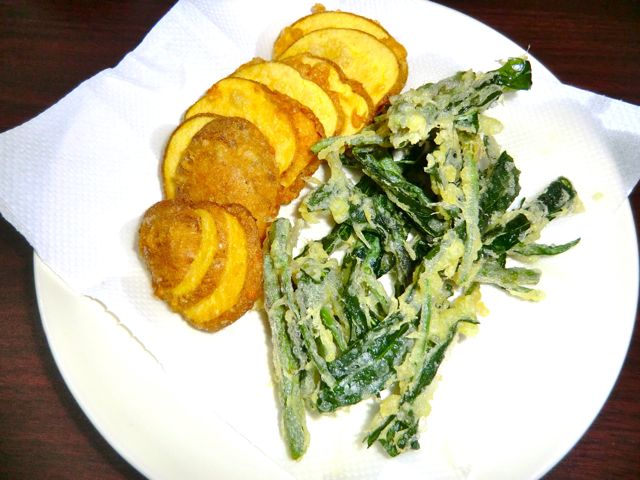ピーマンの肉詰め天ぷらと、じゃがいも天ぷら、空芯菜の天ぷらを作る。
