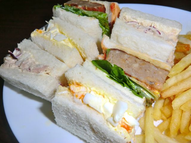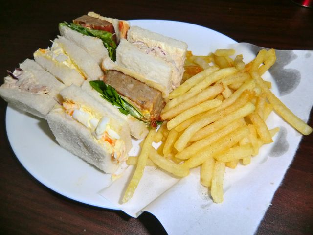 ツナサンドと、玉子サンド、マルシンのハンバーグサンドとポテトの盛り合わせ。