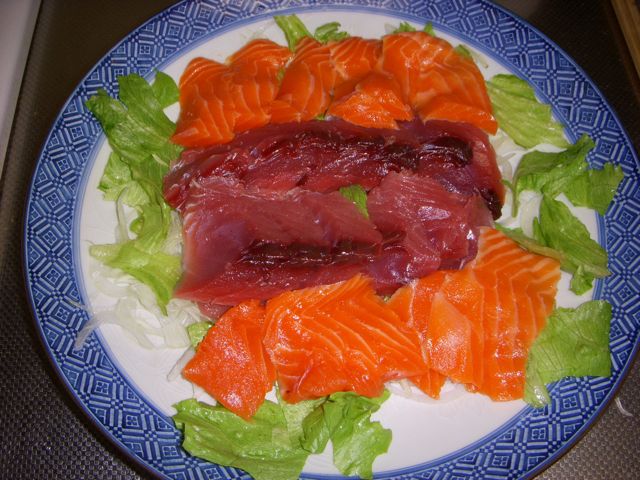 香味野菜色々。かつお、サーモン(今回は飛び入りで)、ニンニク&オニオンチップ、香味油、ポン酢醤油。