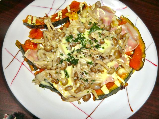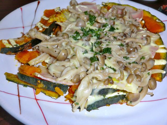 しめじベージンはすぐに火が通るので、火が通ったら並べたカボチャの上に乗せます。