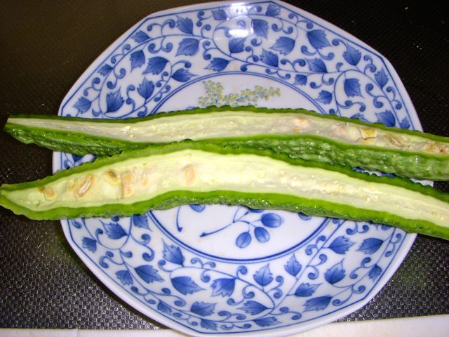 1、ゴーヤをわって種を外し、薄切りにしておく。