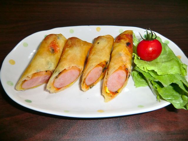 春巻きの皮で巻き、多めの油で焼くように転がしてるだけ。