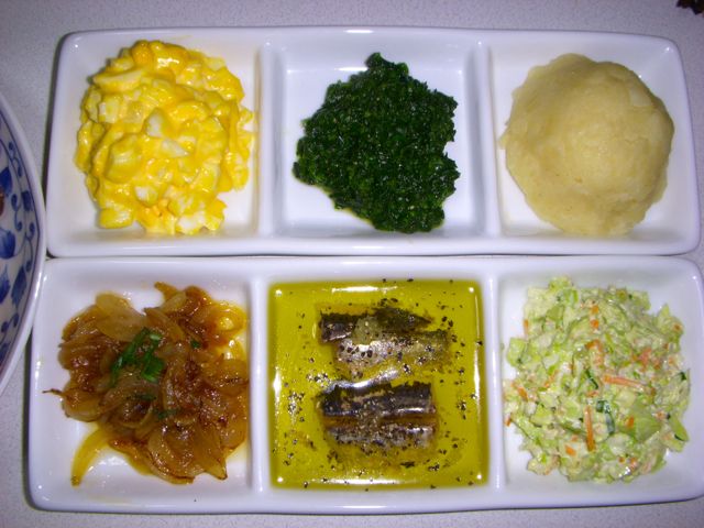 玉子マヨネーズ、コンソメほうれん草、マッシュポテト、オニオン炒め、オイルサーディン、コールスロー。