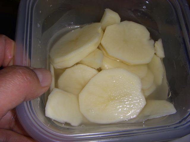 薄切りにしたジャガイモを、ジップロックコンテナ入れ、ひたひたまで水を入れて、レンジで加熱。
