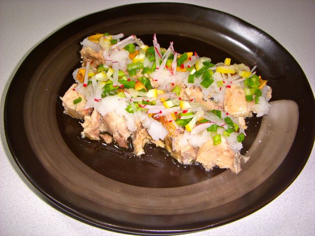 たまたまラディッシュとレモンがあったので、刻んで乗せてみた。