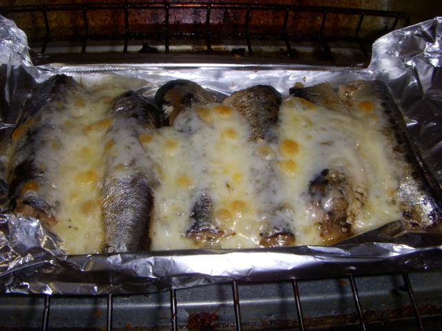 オイルサーディンは、オリーブオイルとバジルをふりかけ、チーズを載せて焼いておく。