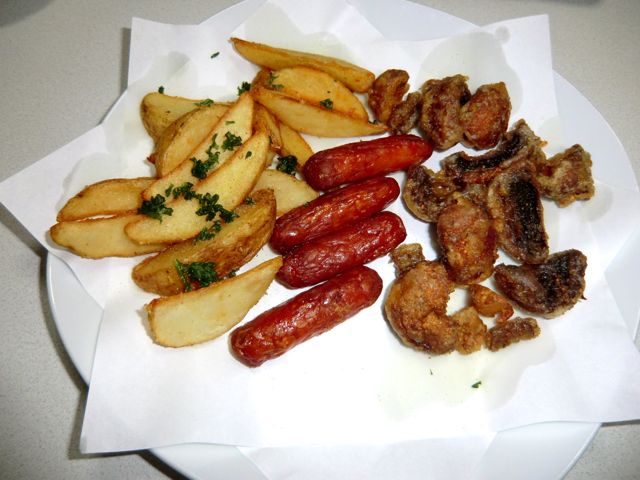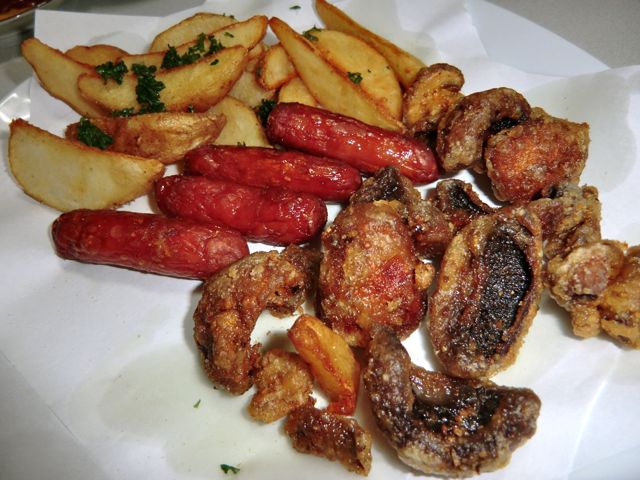 ポテト、シーセージ、マッシュルームの揚げ物三種。