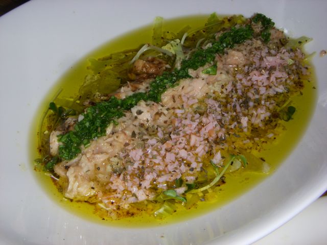 オリーブオイルをたっぷりバケットにつけて食べる。
