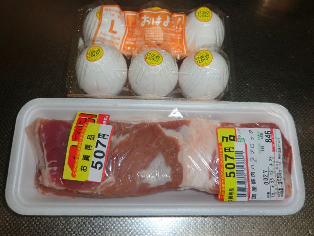 だし汁(水と味付けは、醤油、みりん1:1です。お好みで味加減を)で豚バラブロックと、茹で玉子を煮ます。