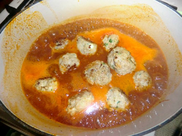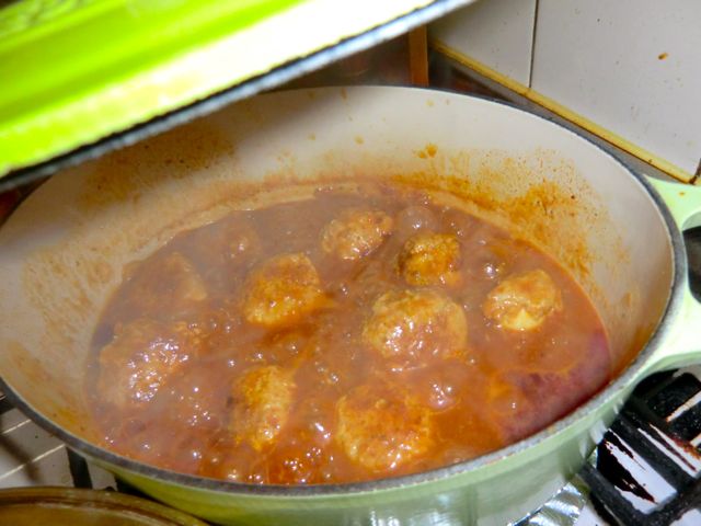 焼き上がったハンバーグを投入し、煮込んで火を通す。