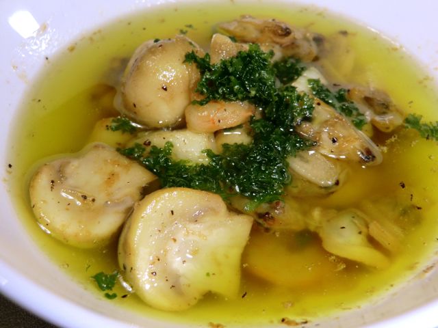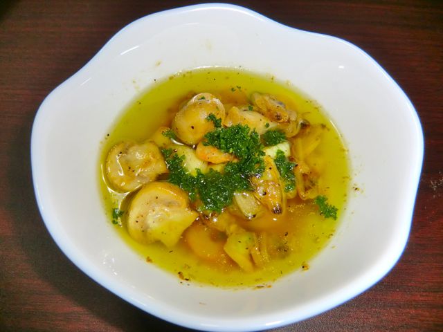 解凍してた魚介類と、マッシュルームを多めに刻んだにんにくと、多めのオイルで