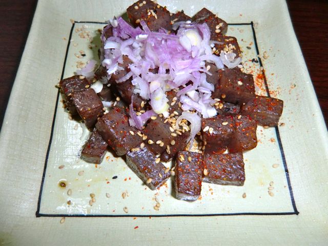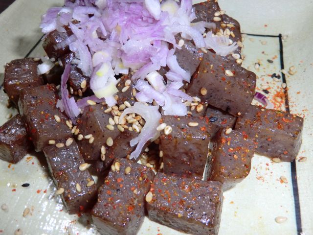 こんにゃくを好きな大きさに切って、塩こしょうと味の素で炒め、唐辛子をまぶして出来上がり。