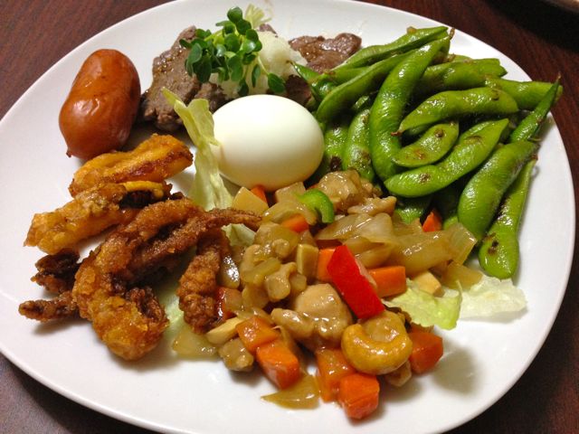 スーパーで総菜なんかを買ってきて、家呑みプレートを作る。
