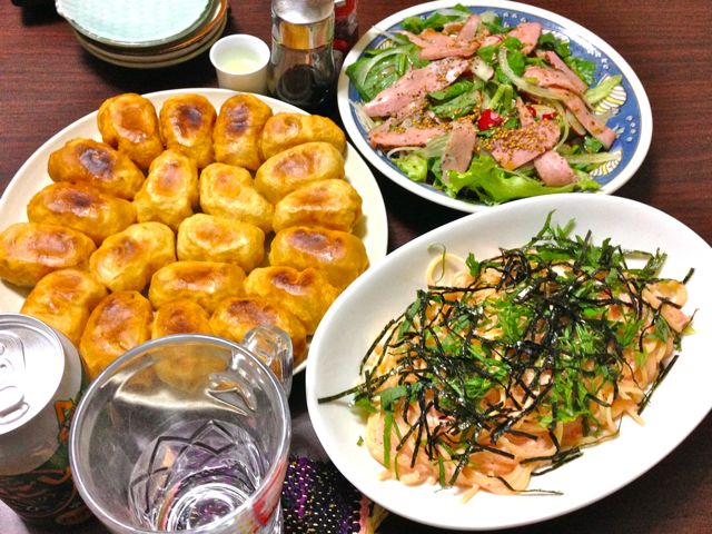 明太子クリームスパゲティーと、年末のお歳暮のハムで作ったサラダ。