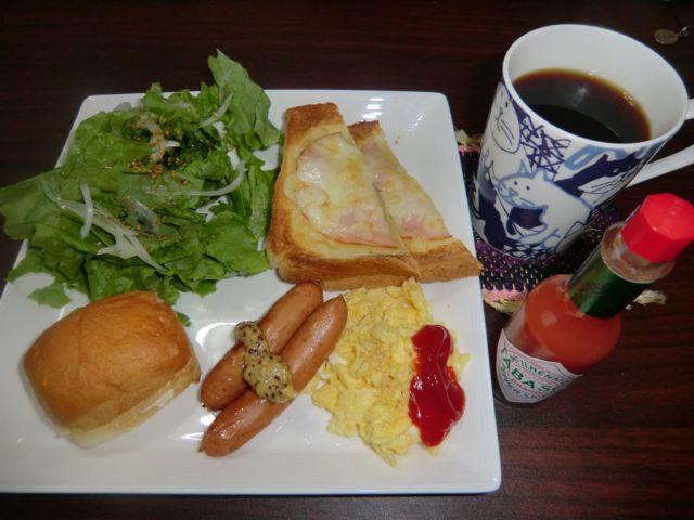 コストコで購入したパンと、ハムチーズトースト、スクランブルエッグとソーセージ、グリーンサラダ。