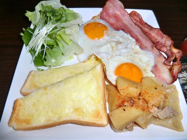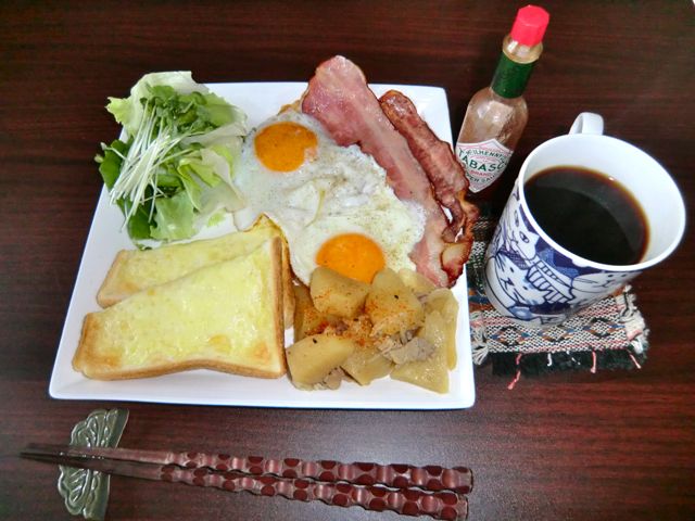 今朝は、チーズトースト、ベーコンエッグ、サラダ、肉じゃがという組み合わせ。