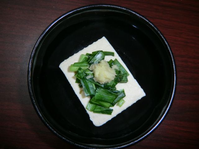 刻んでから軽くレンジしたニラとおろしショウガをのせて。