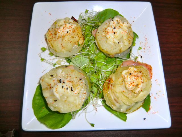 玉ネギの上にチーズをのせ、焼いたベーコンとレンジ加熱したジャガイモをのせ、マヨネーズをかけてトースターで焼いたもの。
