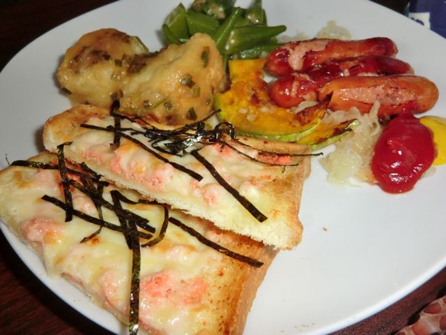 本日の朝食プレートは、明太子チーズトースト、シャウエッセン、カボチャのガーリック炒め、揚げ出し豆腐、おくらのお浸し。