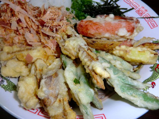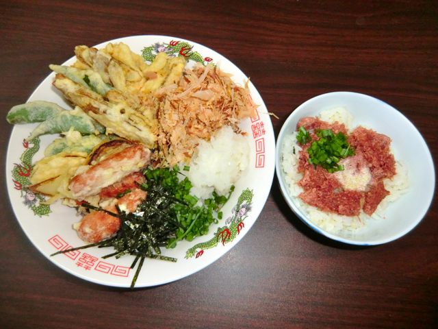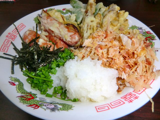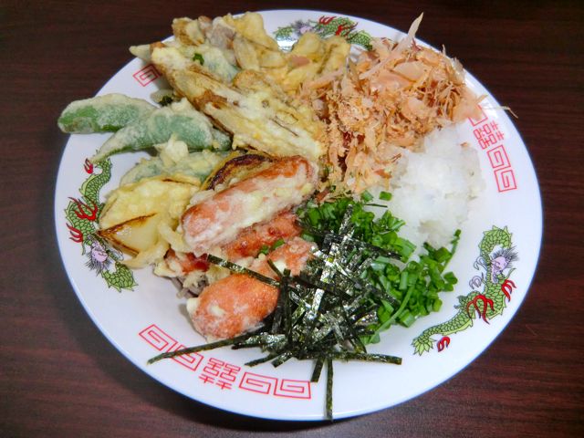 ただ、大根おろしとかつお節だけでは寂しいので、冷蔵庫にあるものを天ぷらにして乗せてみた。