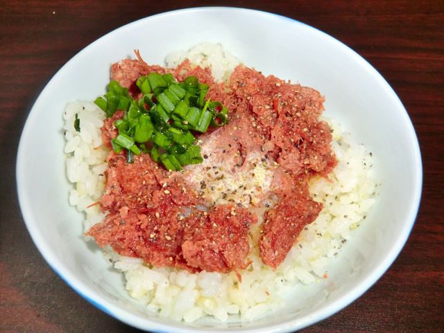 コンビーフご飯は、コンビーフをレンジして、暖かいうちにバターを乗せて、黒こしょうをかけ、