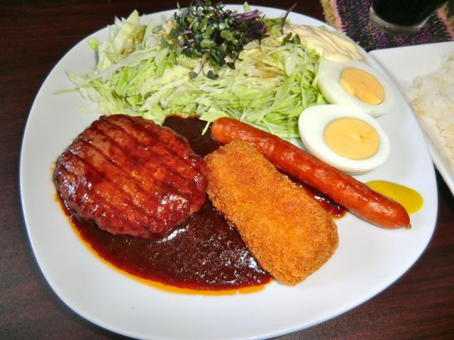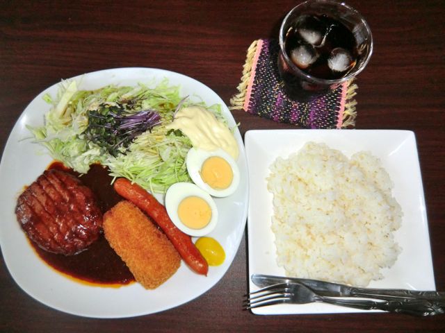 ハンバーグと海老寄せフライ、ソーセージの盛り合わせなんだけども、ハンバーグは