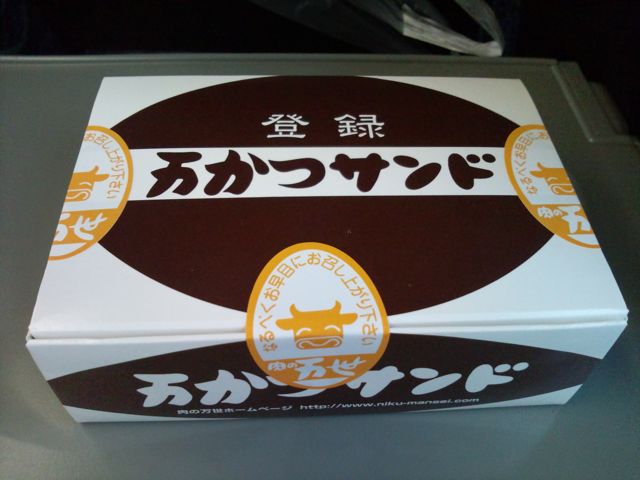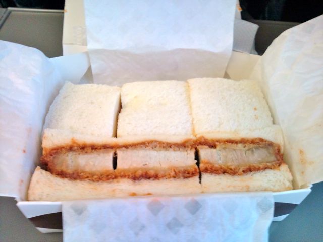 行きは、上野で肉の万世で発売してる万かつサンドを買って行った。