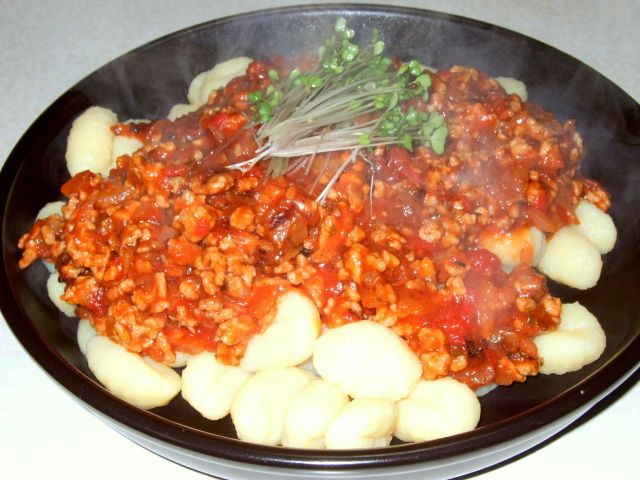 ニンニクのみじん切りをオリーブオイルで炒めたら、タマネギのみじん切りをひき肉を炒め、トマトソース(あらかじめ香辛料や具材が入ってて、味付けされてるやつ)を入れて、少し煮るような感じで火を通す。