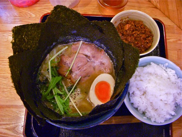 俺の食べ方としては、まずテーブルの上の大根おろしをラーメンにのせ、肉味噌をご飯にかける。