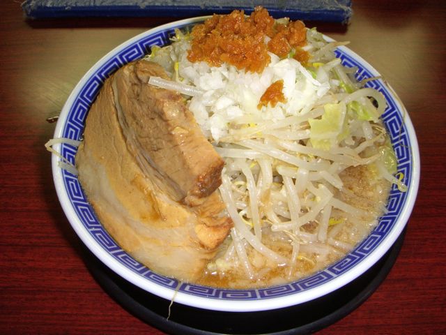 ふじ麺が到着し、しょうゆ漬けニンニクを載せて記念写真を撮る。