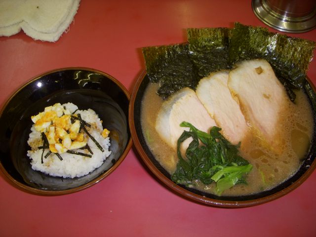 いっしょに行った連れは、麺少なめのサービストッピングは青ネギ、普通のライスにまなかいご飯トッピングはチャーシューで注文、味は薄味だった。