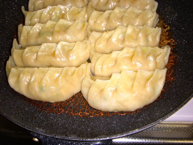 1、フライパンに油をしき、全体にのばしたら、すぐ餃子を並べる。
