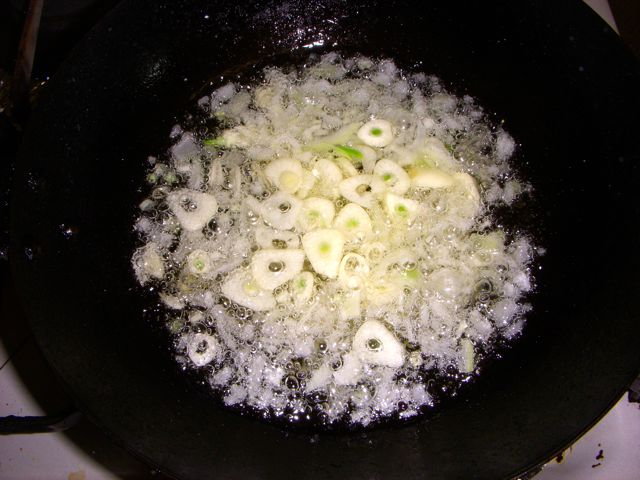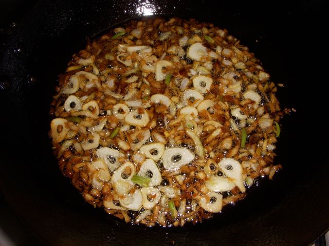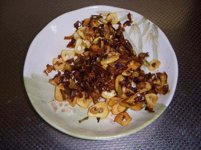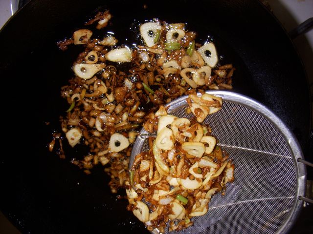 スライスしたニンニクと、みじん切りにした玉ねぎを、ゆっくり油で揚げていく。