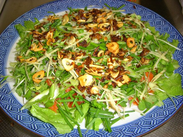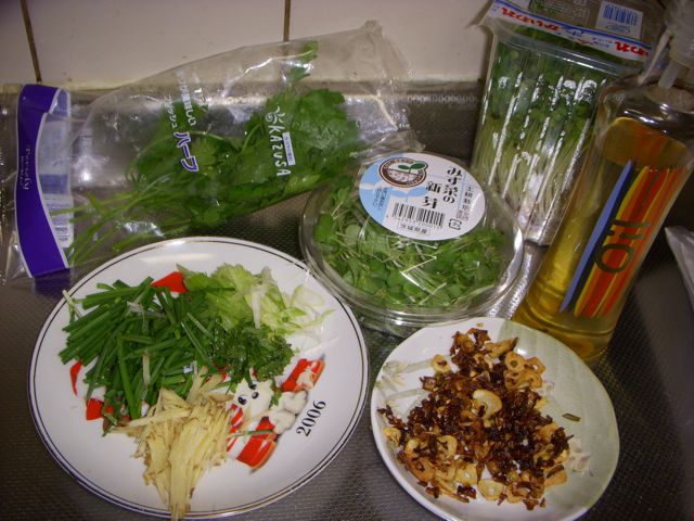 香味野菜色々。かつお、サーモン(今回は飛び入りで)、ニンニク&オニオンチップ、香味油、ポン酢醤油。