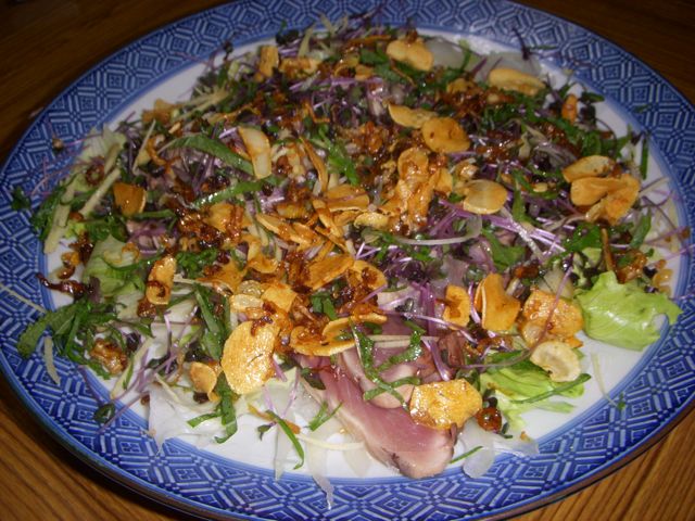 今回は、玉ねぎのスライスとレタスを下にひいて、紫キャベツのスプラウト、青じそと生姜のみじん切りをかけている。