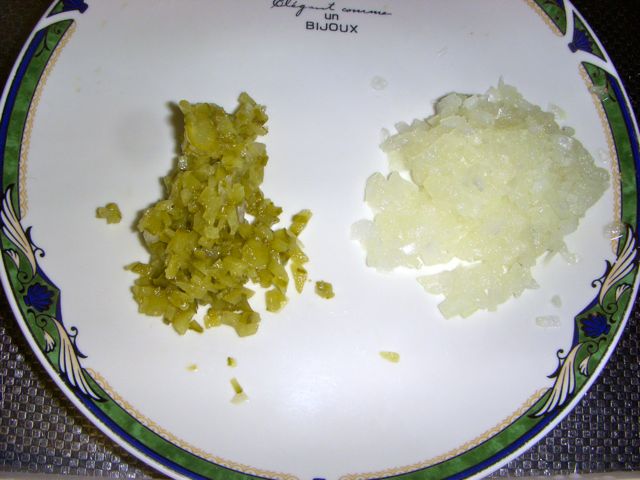 1、なくてもいいけど、玉ねぎとピクルスをみじん切りにする。