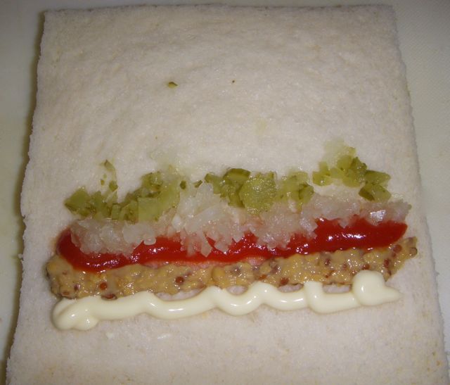 3、パンに、ケチャップ、マヨネーズ、マスタードと、最初に玉ねぎとピクルスのみじん切りをのせる。